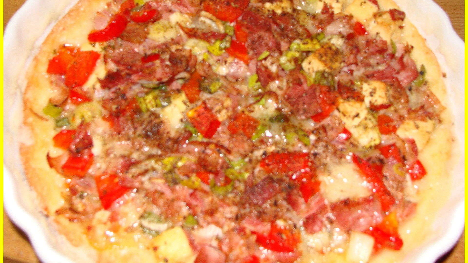 - Na povrch těsta rozprostřete plátky anglické slaniny a tvarůžky, rozkrájené na menší kousky.