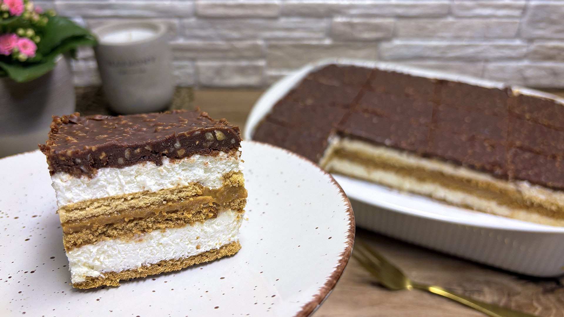 - Na dno formy o velikosti cca 20 × 30 cm vyskládejte vrstvu máslových sušenek, naneste polovinu krému, uhlaďte a dejte druhou vrstvu sušenek. Rozetřete karamelovou vrstvu. Vyskládejte třetí vrstvu sušenek, naneste zbytek krému, uhlaďte a dejte do lednice.