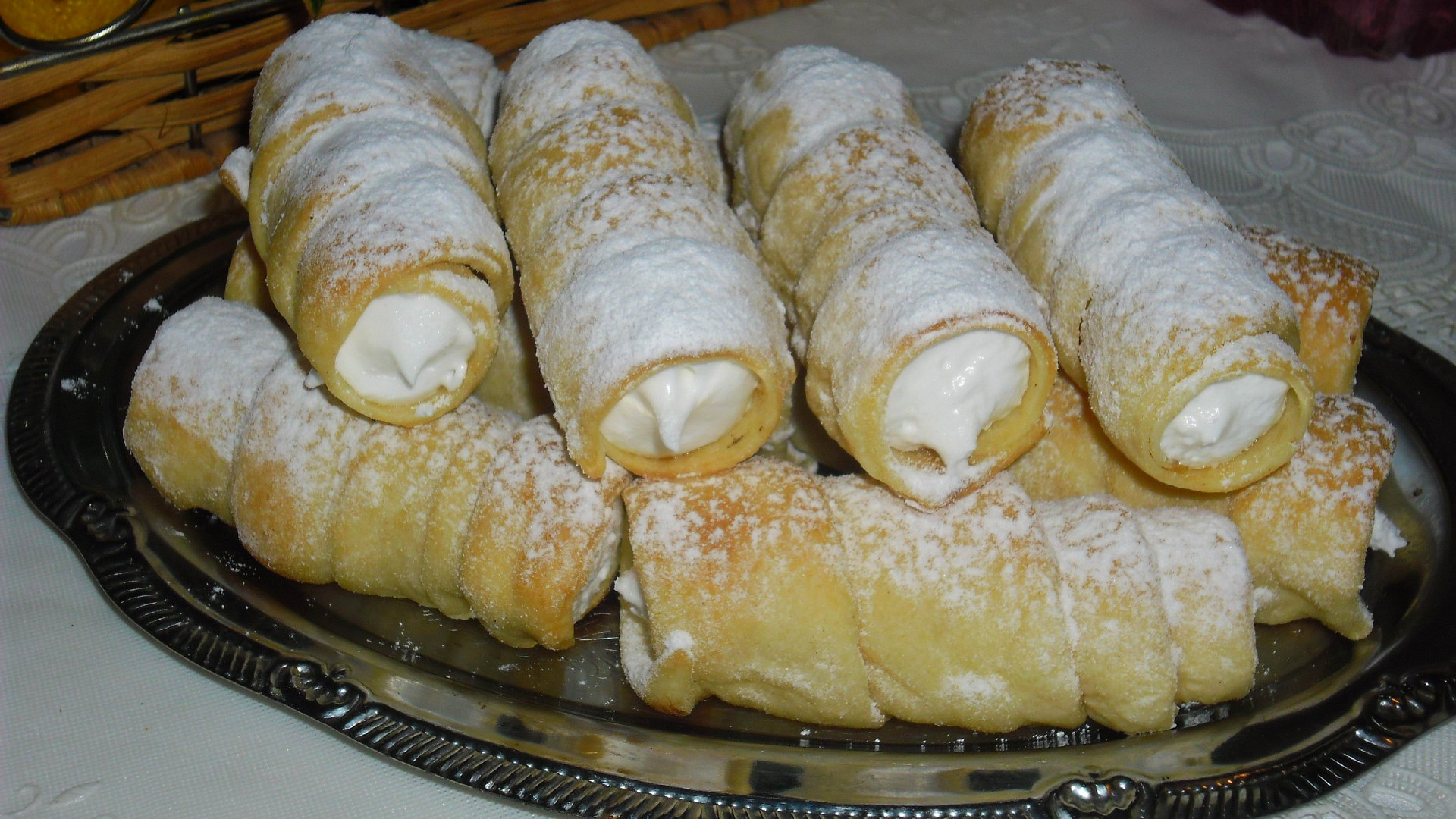 Pro jejich přípravu potřebujete kovové trubičky, na které se navíjí pásy listového těsta. Jestliže je nemáte, nevadí. Můžete si např. z kousku kartonu trubičky stočit (podmínkou je nepoužívat žádné lepidlo ani gumičky na spojení) a ovinout je pak alobalem. Tím získáte poměrně pevné trubičky, které mohou přijít do styku jak s potravinami, tak s teplem v troubě.