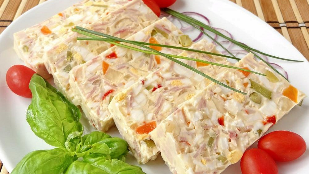 Základem je kombinace natvrdo uvařených vajec, kvalitní šunky nebo měkkého salámu, sterilované zeleniny (nejčastěji hrášku, mrkve či kukuřice) a jemného nálevu z vývaru a želatiny. Právě ten drží vše pohromadě a vytváří typickou rosolovitou strukturu. Nezapomeňte, že je potřeba použít želatinu pro výrobu vaječné tlačenky, a ne dortové želé.