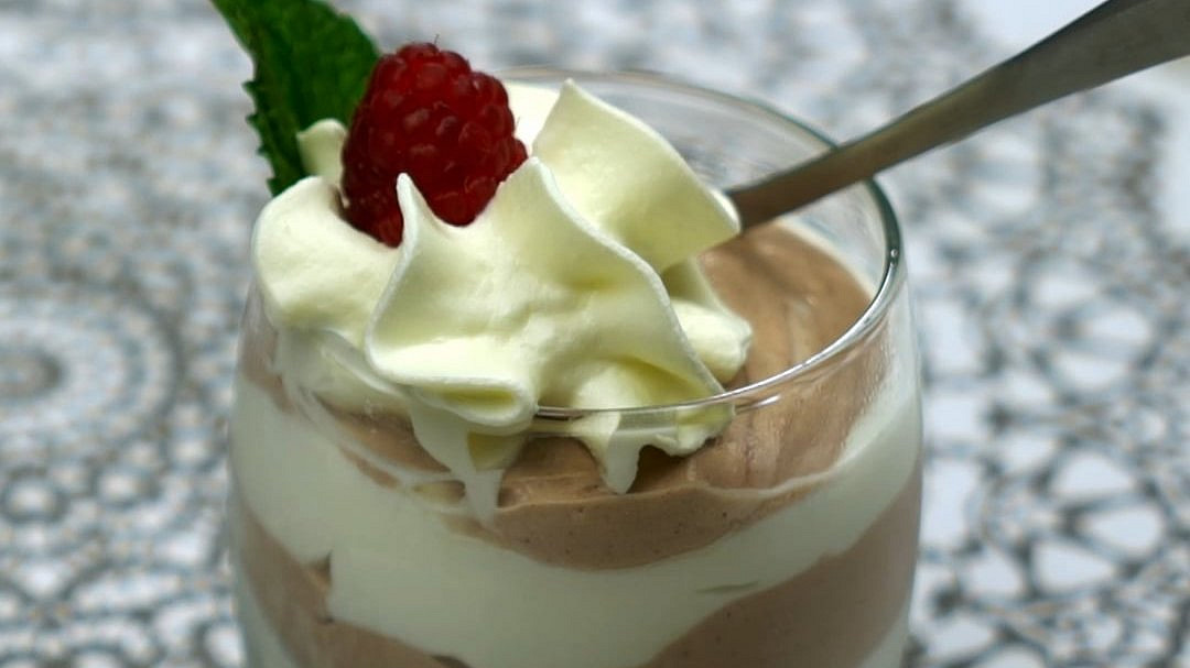 Rozdělte na dvě poloviny a do jemné přimíchejte kakao (stačí 1-2 lžičky). Do sklenice či misky střídavě vrstvěte světlou a tmavou vrstvu a dejte vychladit do lednice.