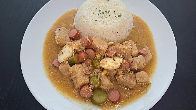 - Ke konci dušení přidejte k masu okurky, párky a vejce. Přilijte trochu láku z okurek. Promíchejte a krátce prohřejte. Podávejte s rýží.