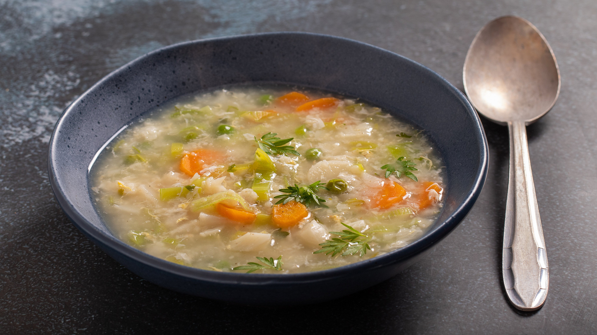 - Pak přidejte hrášek, dochuťte pepřem, solí, zbývajícím pórkem a pažitkou. Nakonec za stálého míchání vlijte rozkvedlané žloutky a nechte už jen projít varem.