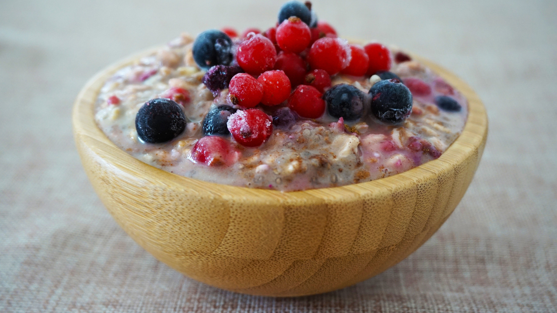 Co budete potřebovat: 50 g ovesných vloček, 250 ml vody nebo neslazeného ovesného nápoje, špetku soli (krásně vytáhne chuť), lžičku drcených lněných semínek (skvělý zdroj prospěšných tuků), hrst čerstvého bobulovitého ovoce (borůvky nebo maliny), půl lžičky mleté skořice
