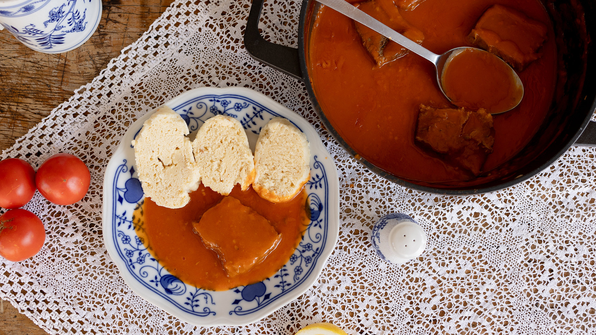 - Omáčku podávejte s plátky masa a houskovými knedlíky.