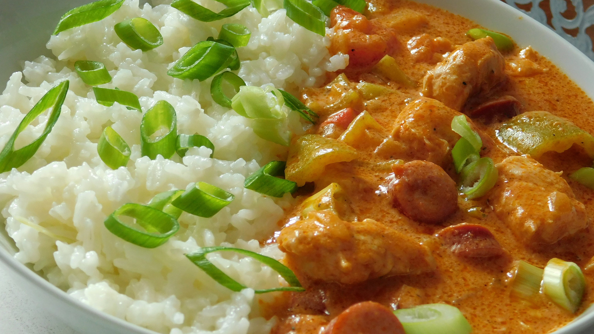 Na čtyři porce budete potřebovat: 3 kuřecí prsa, 1 cibuli, 2 stroužky česneku, 2 debrecínské párky, 1 zelenou papriku, 1 větší rajče, 1 lžíci protlaku, 1 lžíci hladké mouky, 2 lžíce zakysané smetany, olej (nebo sádlo), vývar, sůl, mletý pepř, 1 špetku chilli a 1 špetku cukru.