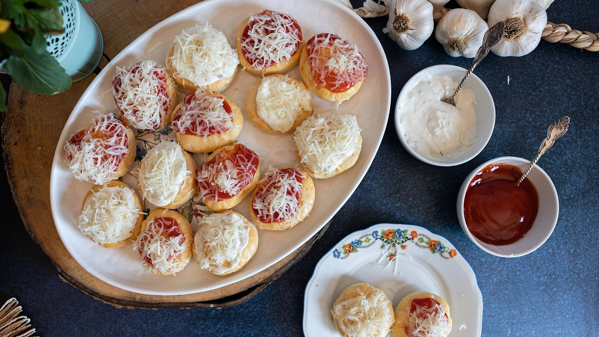 - Po upečení potřete kolečka olejem smíchaným s prolisovaným česnekem. Následně přidejte kečup nebo tatarskou omáčku podle chuti a nakonec posypte strouhaným sýrem.