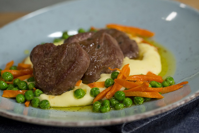Telecí s krémovou bramborovou kaší, mrkví a hráškem