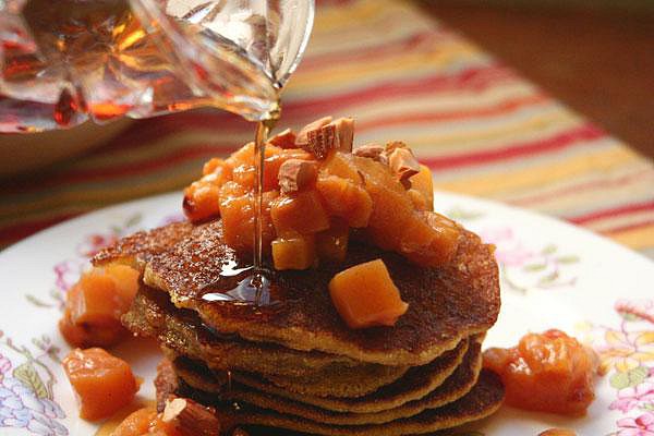 10 předem připravených lívanců, 3 kaki, 2 lžíce másla, 1 hrst nasekaných ořechů, 4 lžíce medu, nebo javorového sirupu