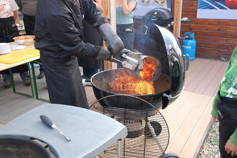 Na kurz grilování, konaný v příjemném zahradním areálu, dorazilo včetně mě asi 20 učňů a dva kuchaři v černých rondonech. Na prostorné zahradě bylo rozmístěno několik grilů (zde dostalo mé přesvědčení, jak má vypadat gril, definitivní KO) a stánků se stoly prohýbajícími se pod čerstvým masem, zeleninou a dalšími surovinami. V první části kurzu nás lektoři seznámili s možnostmi moderních grilů. Dozvěděl jsem se mimo jiné, že na grilu se dá uvařit třeba segedínský guláš, palačinky, pizza nebo popcorn. Nic z toho by mě v životě nenapadlo, a tak jsem byl trošku v šoku. Ale jen do doby, než nám to naši trpěliví učitelé předvedli v praxi. Stačí vyměnit část roštu za hrnec a můžete vařit guláš. Nebo místo hrnce dáte pánev a za pár minut máte palačinky. Celkem se na grilu vystřídala dobrá desítka nádobí a na každém šlo udělat jídlo, které bych s grilováním nikdy nespojil.