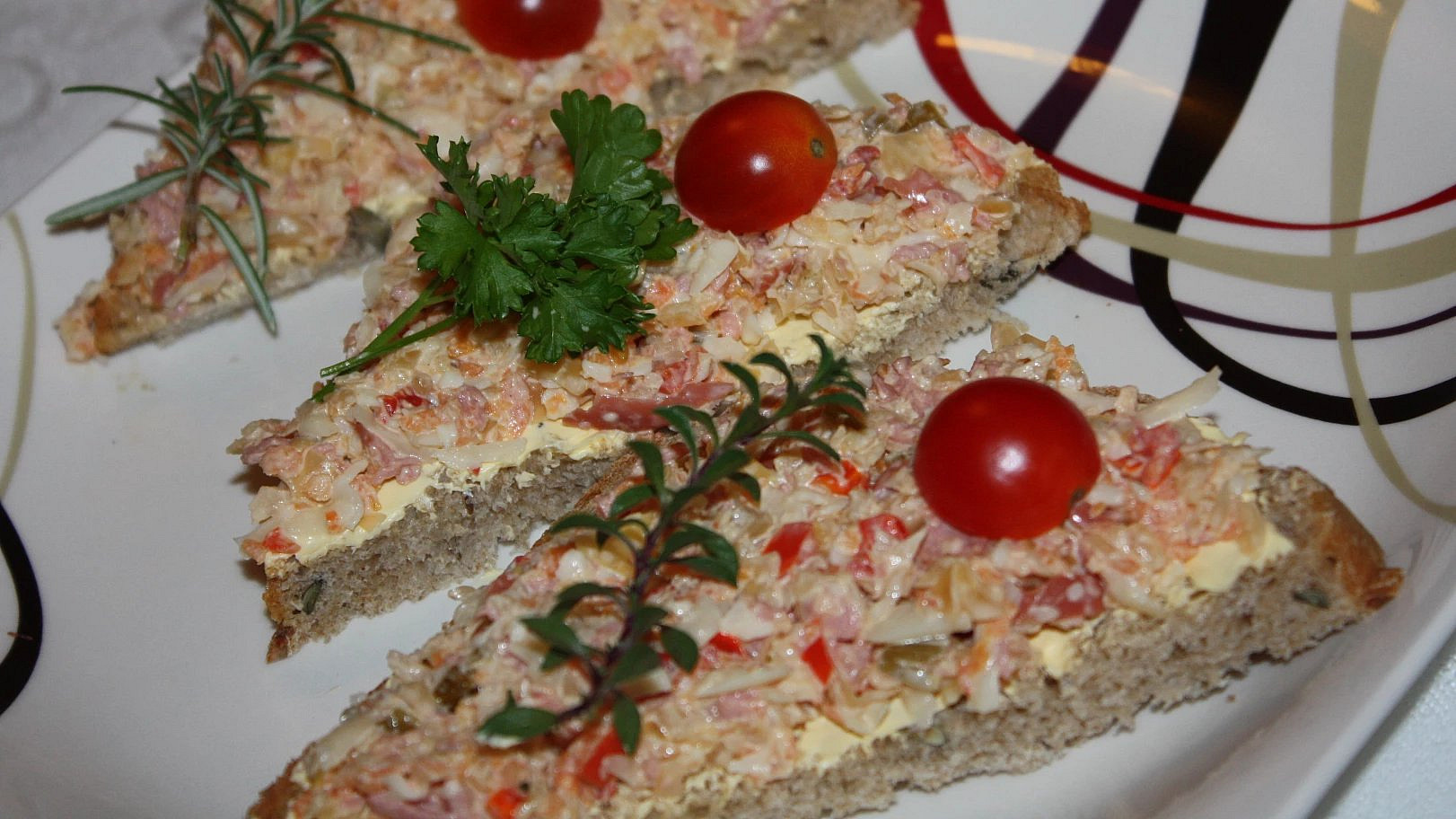 Jednoduchá pomazánka z Moravanky: Pikantní chuť doplňuje salám a sýr, ideální kombinace na lehkou svačinku nebo večeři