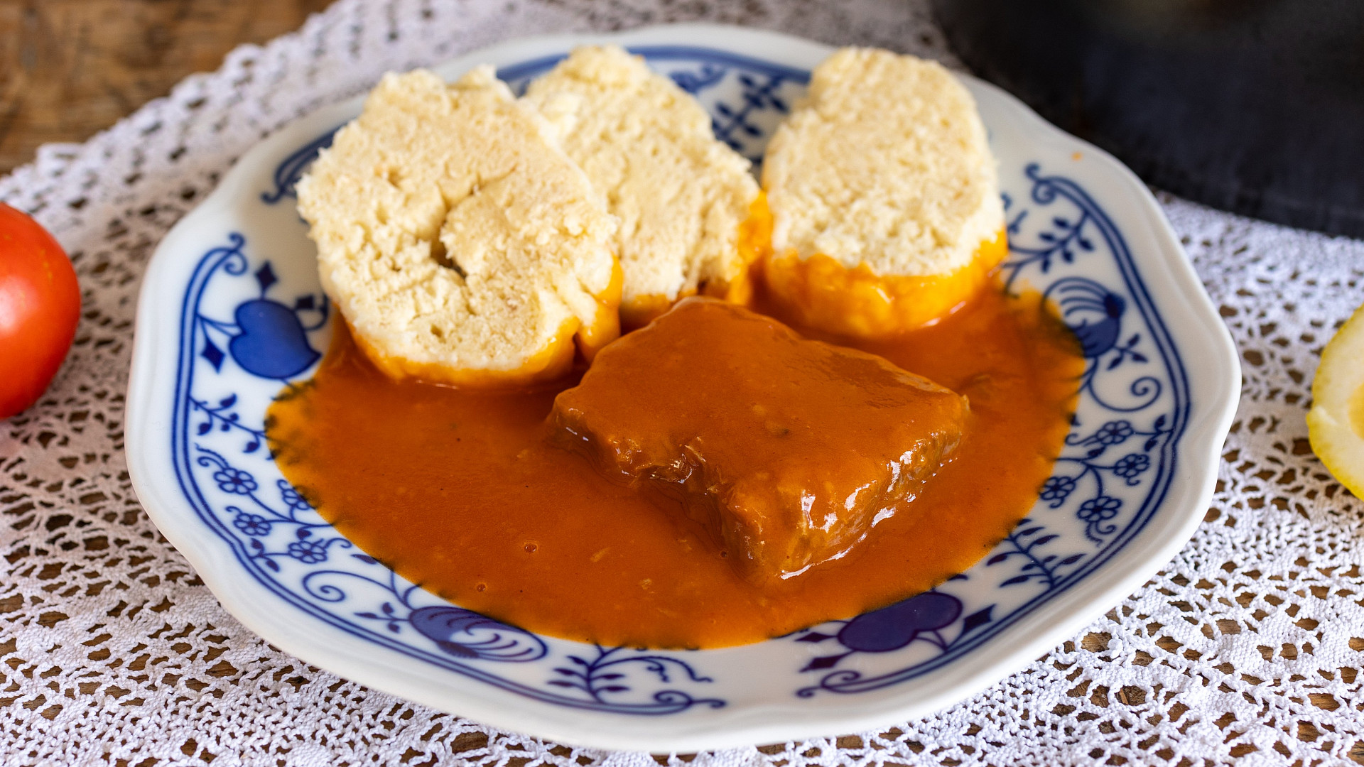 - Maso nakrájejte na plátky, vložte do omáčky a vše krátce prohřejte. Omáčku podávejte s plátky masa a houskovými knedlíky.