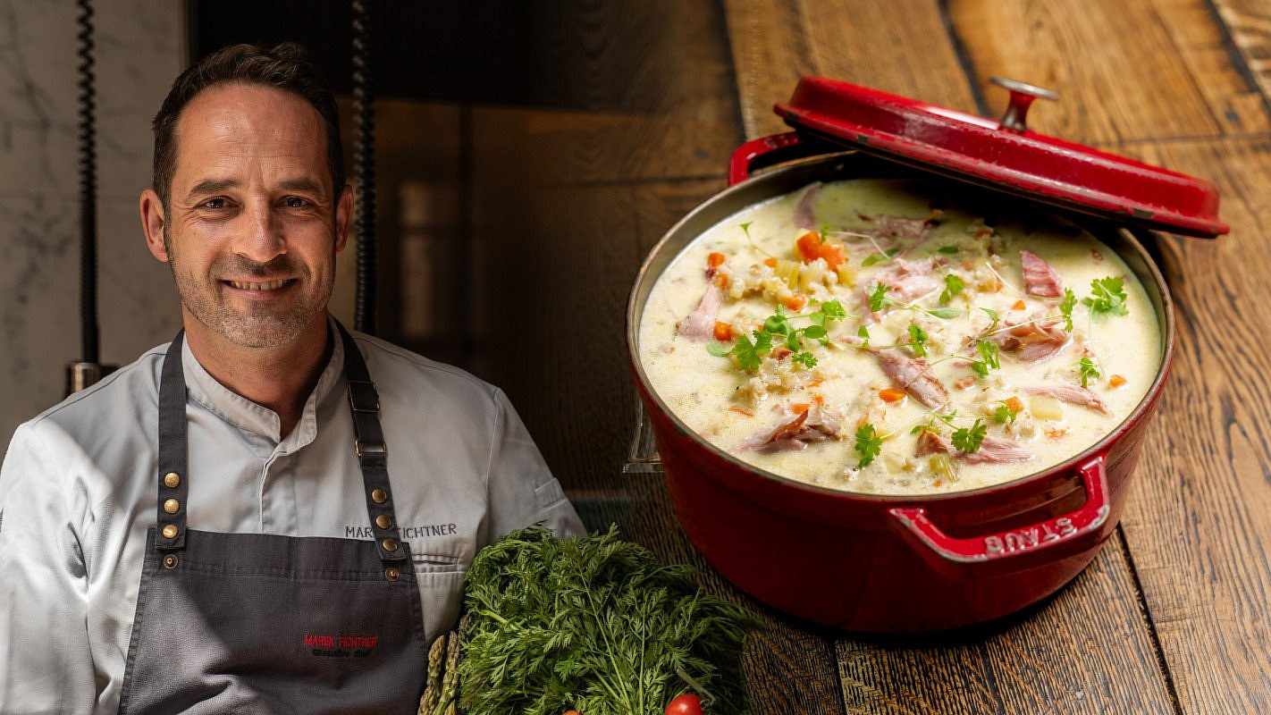 Vydatných polévek, které zahřejí a zasytí, není v zimě nikdy dost. Toužíte-li po nějaké speciální, zkuste třeba tuto švýcarskou kroupovou z uzeného masa. Není to polévka ledajaká, recept nám na ni totiž poskytl známý šéfkuchař restaurace Červený Jelen Marek Fichtner.