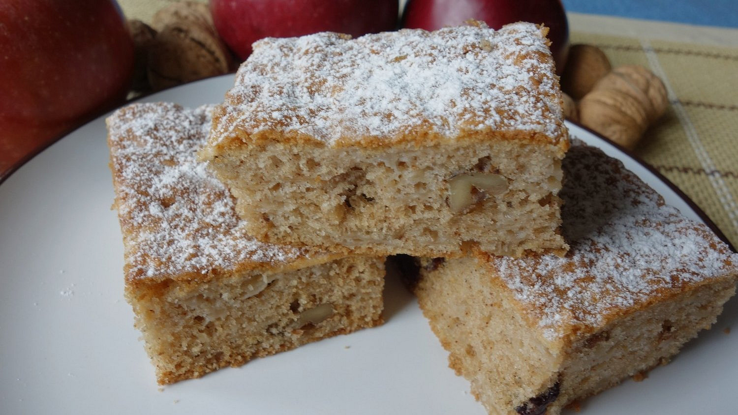 Na šup šup buchtu potřebujete: 3 jablka, 1 hrnek cukru krupice, 2 hrnky hladké mouky, 3 vejce, 1 prášek do pečiva, 2 lžičky skořice, 100 g másla (nebo 1/2 hrnku oleje), půl hrsti vlašských ořechů