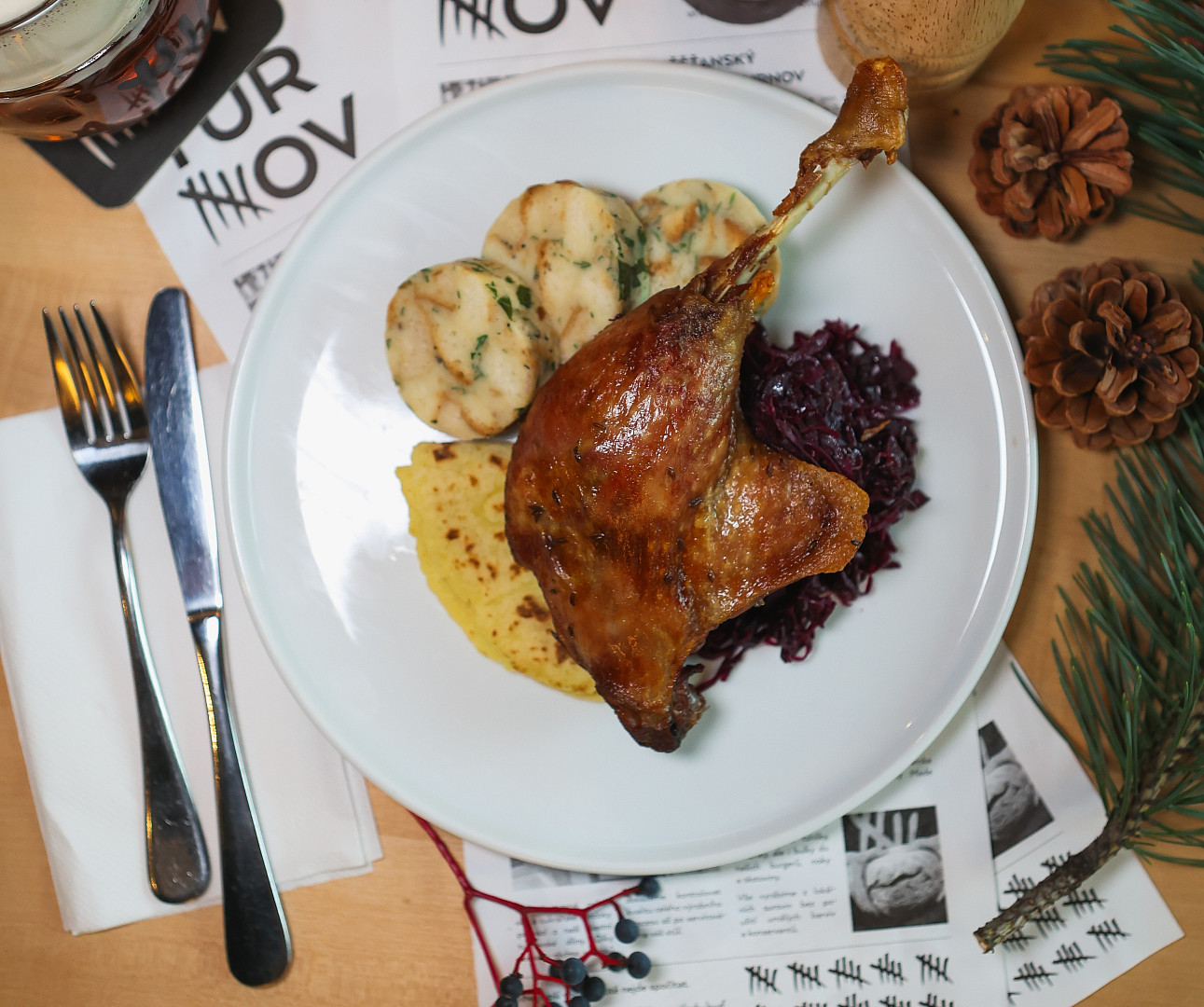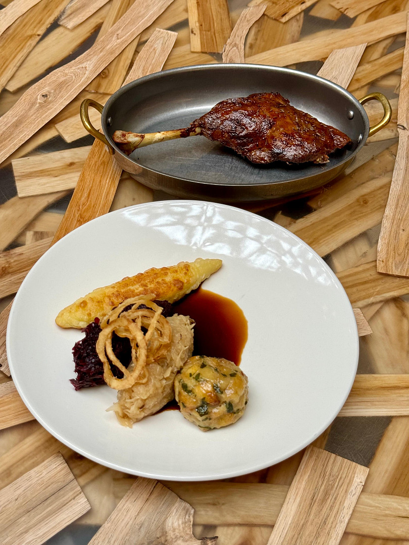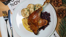 V menu 420 najdete konfitované husí stehno se zadělávaným smetanovým bílým zelím, křížalovým červeným zelím s bramborovou šiškou, bylinkovým knedlíkem a s vídeňskou cibulí. Zdroj: se souhlasem restaurace 420