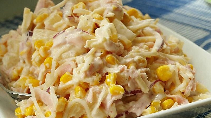 - Do mísy dejte kukuřici, ananas nakrájený na kostičky, šunku, pórek, celer i sýr. Přidejte majonézu a vše důkladně promíchejte.