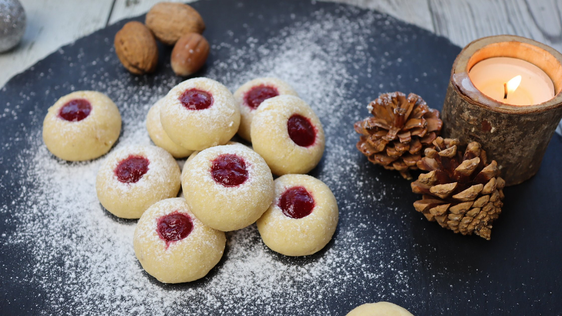 - Upečené koláčky nechte vychladnout a poté důlky naplňte pomocí lžičky nebo cukrářského sáčku marmeládou. Takto připravené koláčky nechte zaschnout na vzduchu asi 1-2 dny. Následně je pocukrujte moučkovým cukrem a uchovávejte v plechové dóze.