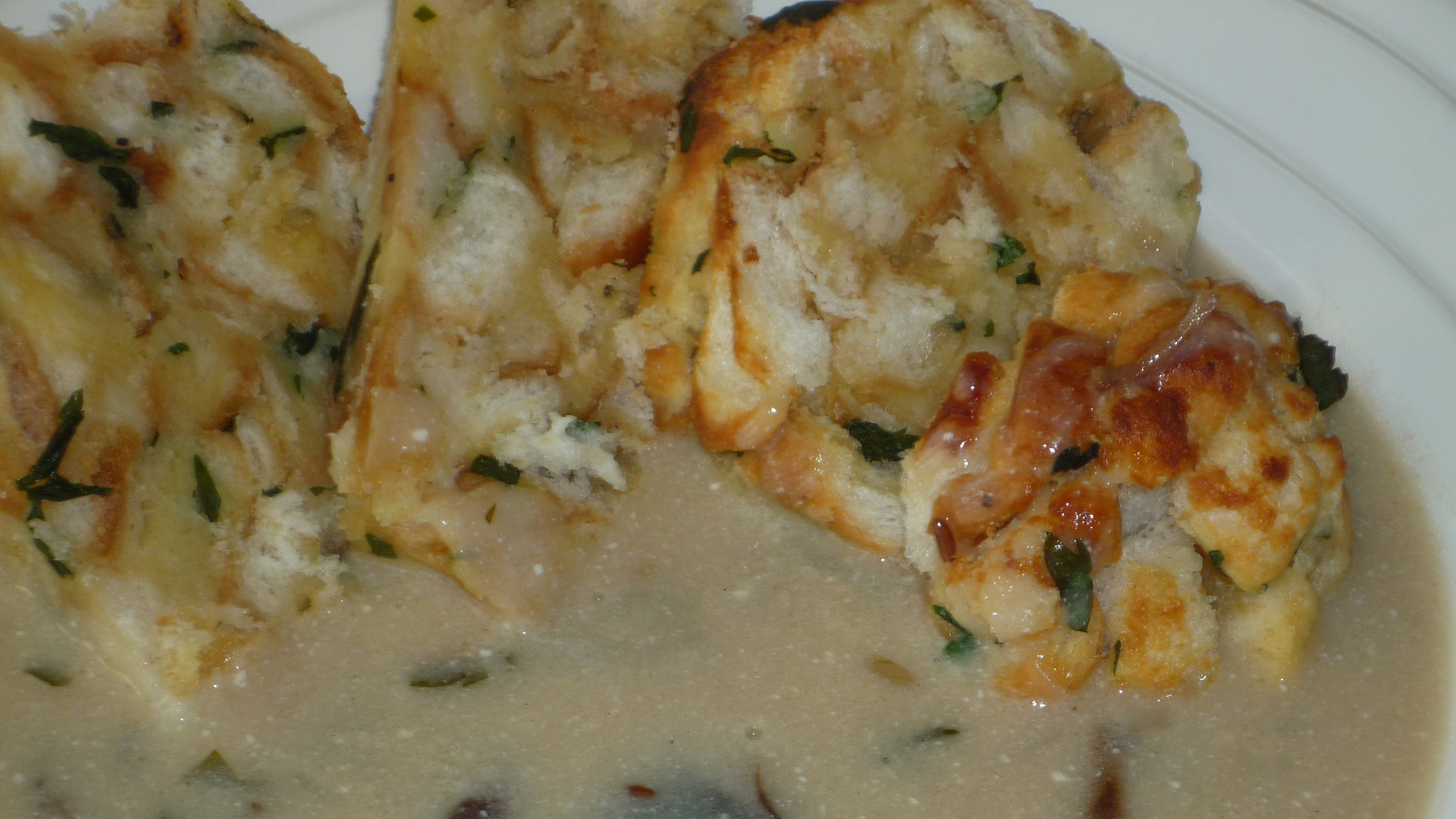 Budete potřebovat: 320 g staršího pečiva, 2 vejce (bílky a žloutky zvlášť), 50 ml rozpuštěného vlažného másla, 150 ml vlažného plnotučného mléka, nasekanou zelenou petrželku, 30 g hrubé mouky, trochu soli.