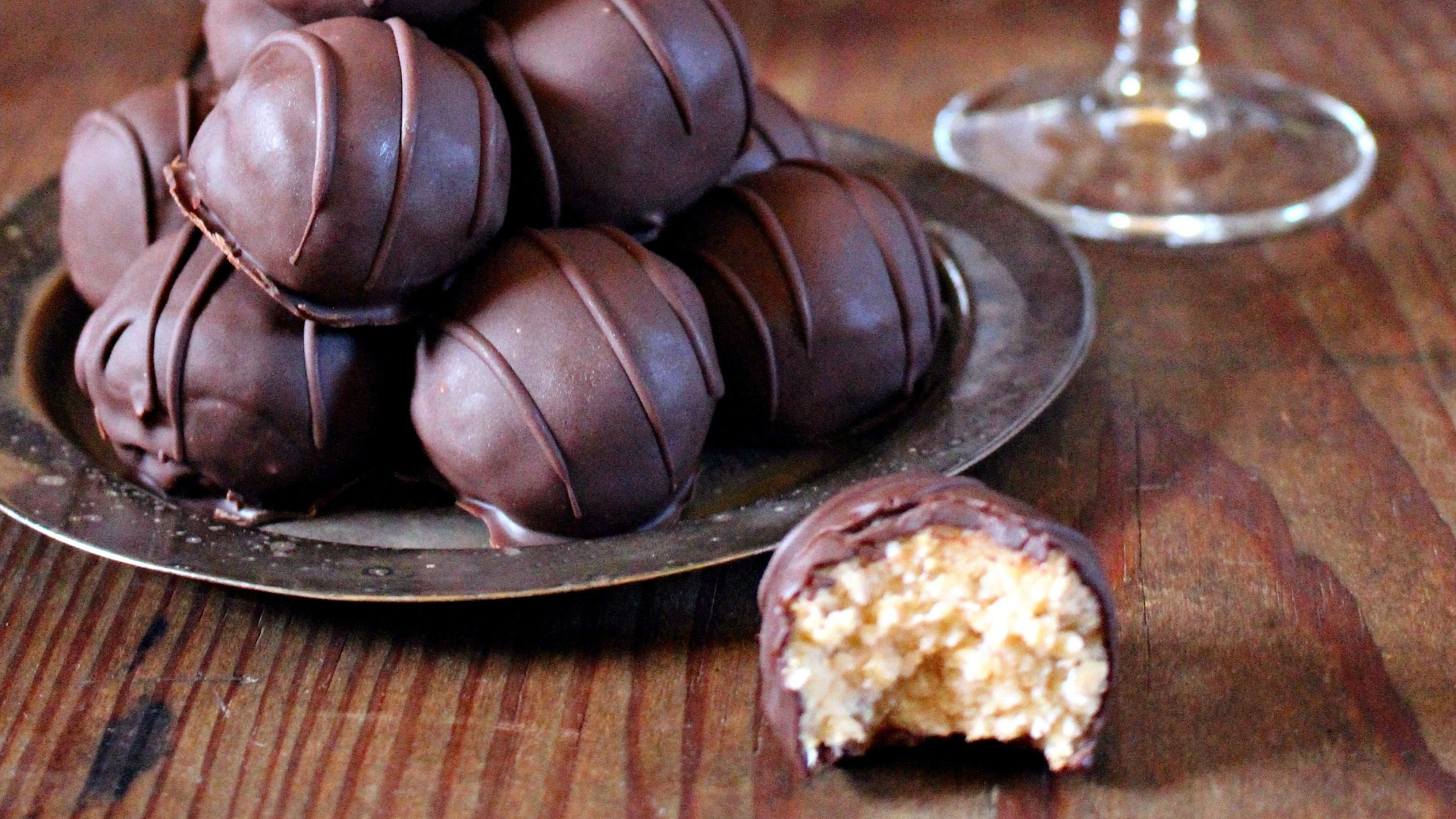 - Ve vodní lázni rozehřejte čokoládu a kuličky v ní namáčejte. Odkládejte je na list pečicího papíru a nechte je ztuhnout.