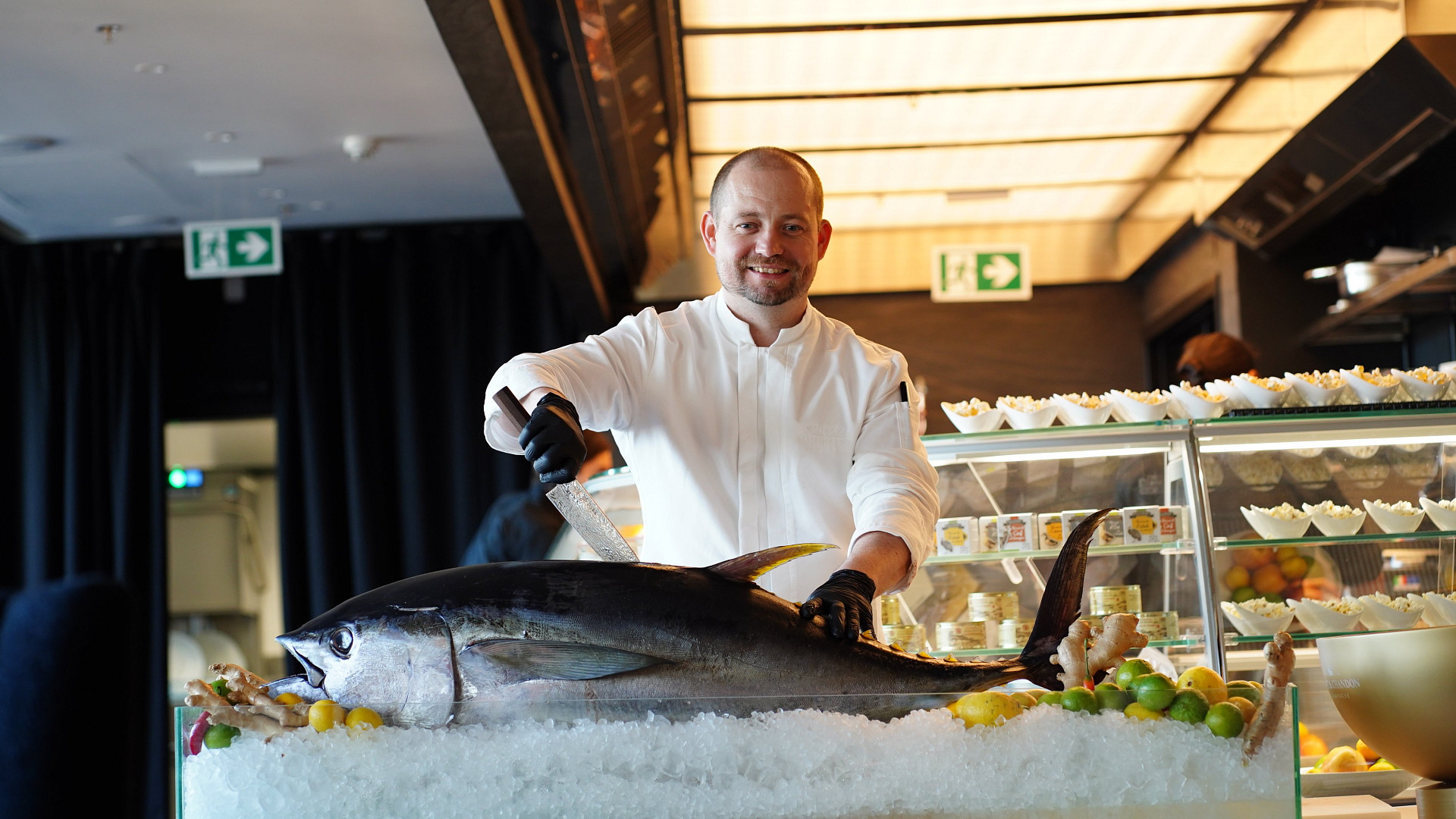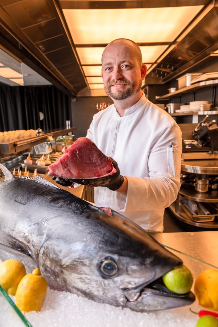 Tuňáka se snažíme co nejvíc podávat v syrovém stavu, třeba ve formě tataráku, tataki nebo carpaccia. A když už děláme steak, propečeme ho maximálně na medium. Tuňák je velká ryba a málokdo ji má možnost vidět celou, proto rybu máme celý den vystavenou v kuchyni, aby si ji hosté mohli prohlédnout.