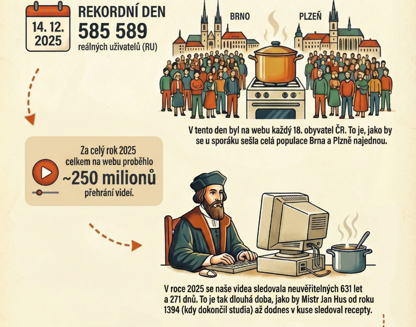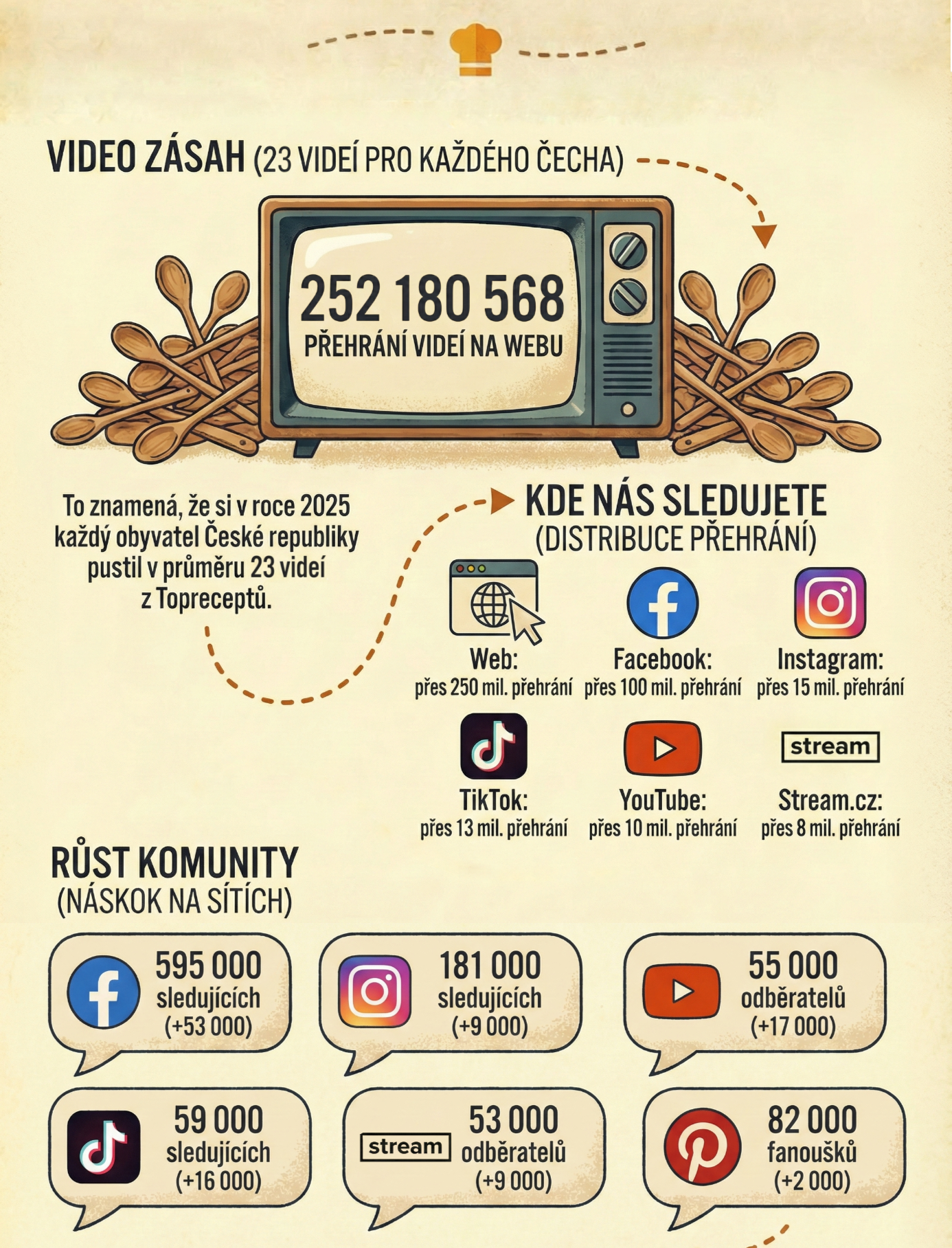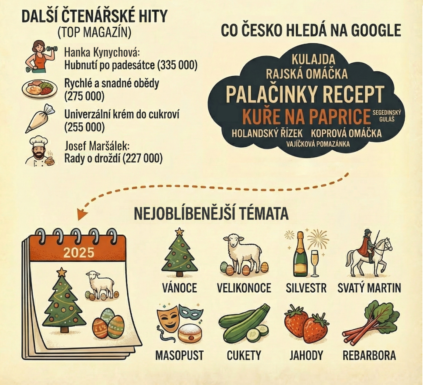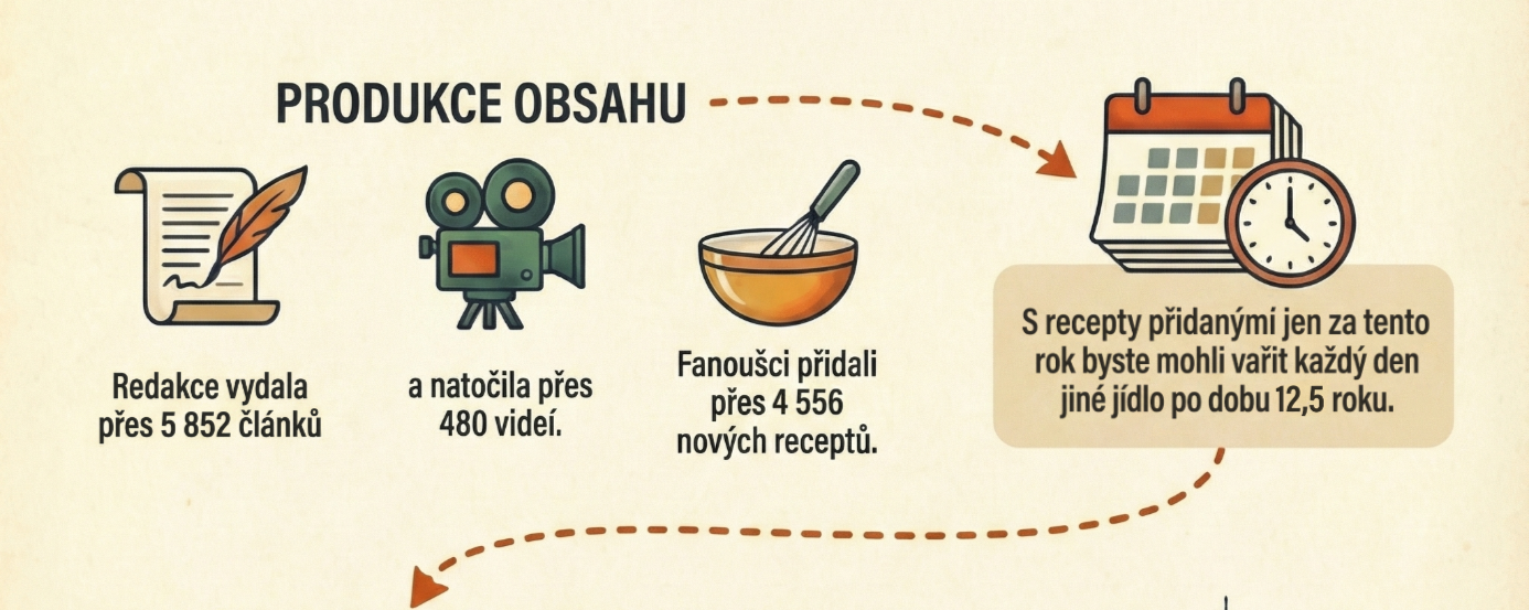 Právě proto, že nás pouštíte do své kuchyně, rozhodli jsme se pustit vás i do té naší a přinášíme přehled za rok 2025. Mrkněte, co se na webu Toprecepty.cz loni nejvíce četlo, vyhledávalo, podle čeho a koho se vařilo. Děkujeme za vaši přízeň, na rok 2026 máme skvěle zaděláno!