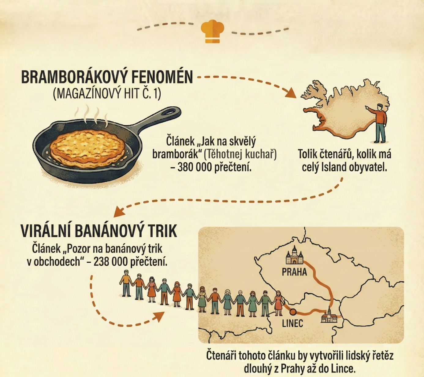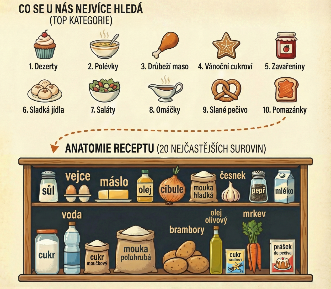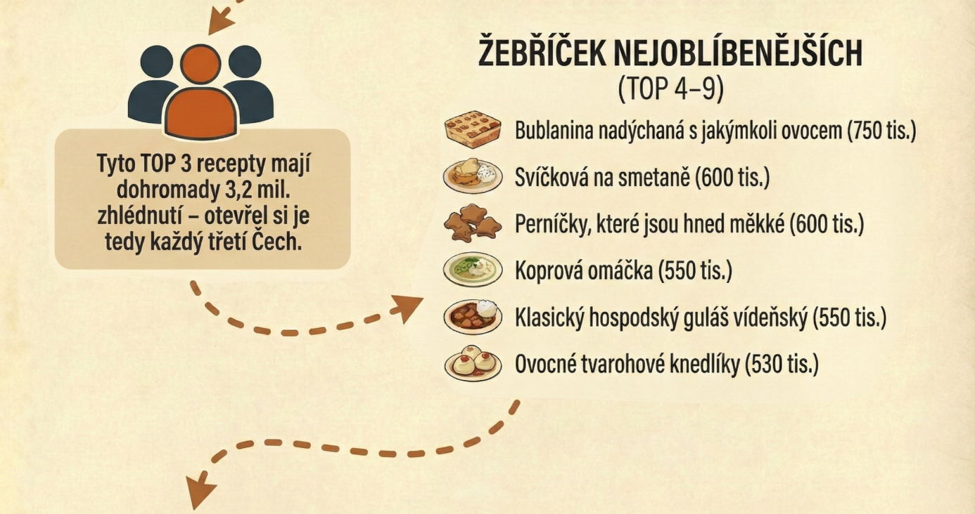 Nejsou to žádné anonymní průzkumy, ani náhodné dotazy na kolemjdoucí, ale jasná data. Web Toprecepty.cz měsíčně navštíví přes 3 miliony reálných uživatelů. A jen za loňský rok jsme zaznamenali 150 milionů návštěv! To je dost na to, abychom z toho, kam kdo u nás klikne, poznali, jak se vaří v Česku a na Moravě.