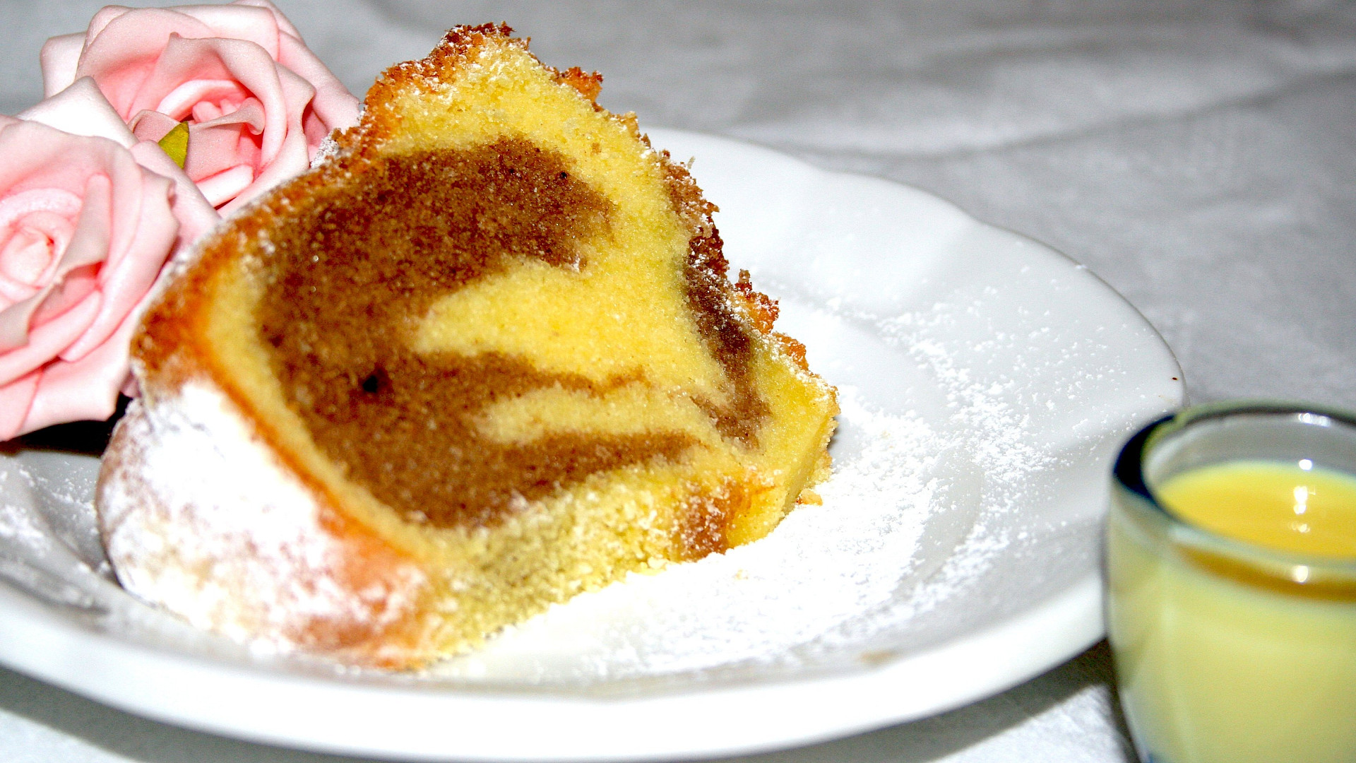 - Tři čtvrtiny těsta nalijte do připravené formy. Do zbytku těsta zamíchejte prosáté kakao, přidejte rum a kakaové těsto nalijte na světlé těsto. Pomocí vidličky nebo špejle vytvořte mramorování.