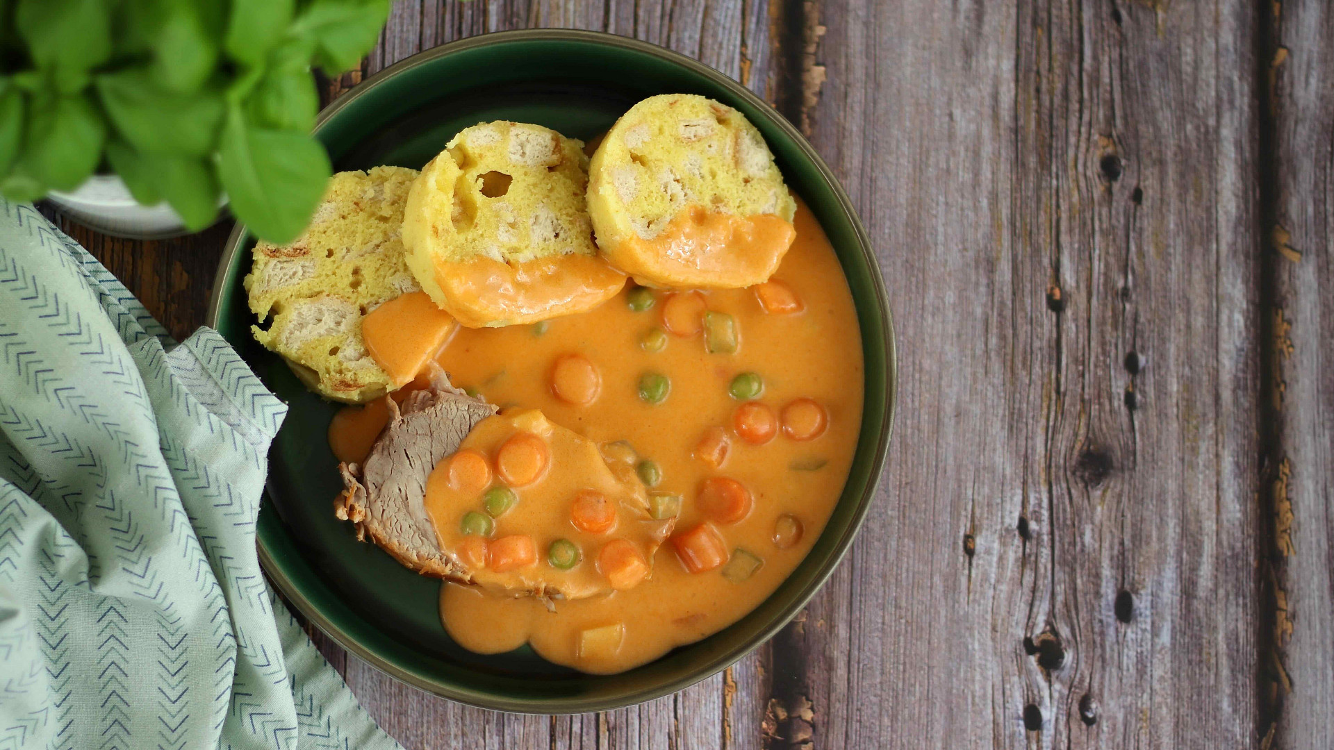 Toto klasické teplé jídlo spojuje výborné maso a výraznou omáčku s překvapivou kombinací sterilované a kořenové zeleniny, rajčatového protlaku a smetany. Výsledná jemná smetanová omáčka se sladkokyselou chutí je vynikající. Jako přílohu si k tomuto jídlu můžeme vychutnat domácí houskový knedlík, rýži, ale i těstoviny.