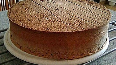 - Těsto pak nalijte do připravené dortové formy (pouze dno vyložené pečicím papírem, jinak žádné vymazávání!). Pečte při teplotě 155 °C asi 40 minut. Dřív troubu neotevírejte. Po 40 minutách vyzkoušejte špejlí, zda je hotovo. Korpus pak vyndejte z trouby, nechte jej 5–10 minut odpočinout, pak jej ostrým nožem opatrně odřízněte od formy a sundejte ji.