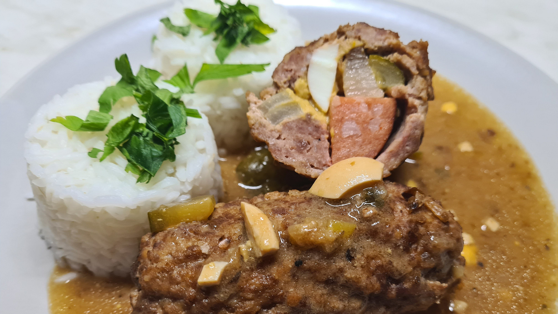 Na 4 porce potřebujete: 500 g mletého masa (směs hovězího a vepřového), trochu vody, 2 lžíce strouhanky — dle potřeby, 2 vejce, sůl a mletý pepř. Na plnění: slaninu, 2 vařená vejce, 2 kyselé okurky, 2 párky, 2 cibule a plnotučnou hořčici. Dále: olej na smažení, 1 cibuli, 1 lžíci mouky na zahuštění a 1 lžíci hořčice.