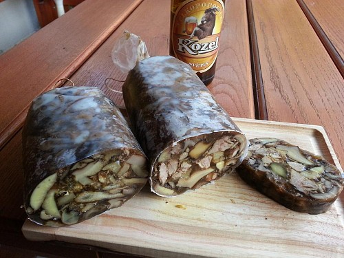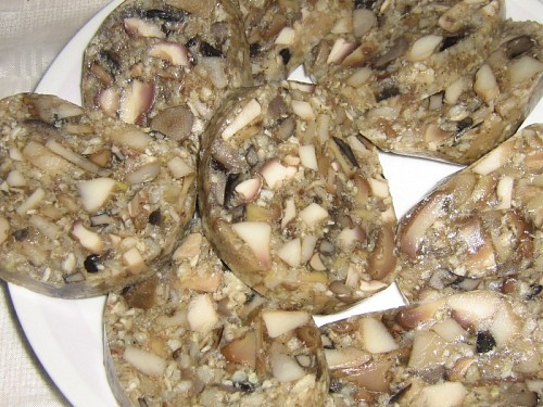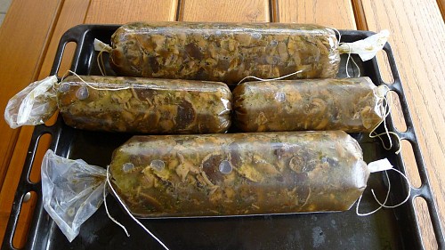Postup: Nožičky+kůže hodněbuvaříme v malinko vody. Zvlášť na velké kusy nakrájené houby. Nožičky obereme a maso,kůži rozemeleme a vrátíme ješjě k provaření s kořením a česnekem. Ochutnáme. Vmícháme ovařené houby a přidáme rozmočenou želatinu a promícháme. Plníme do tlačenkových rukávů a na chladném místě necháme stuhnout. Po hodince otočíme, aby tuk nebyl všechen nahoře.