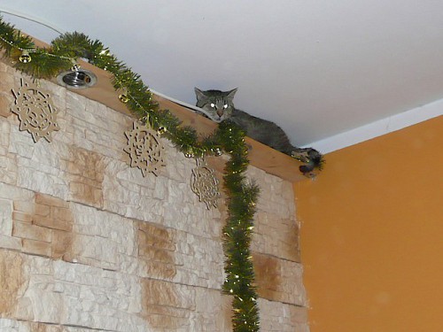 i ji ven k autu...vše ok..zamávali..vše ok..zamkli branku..vše ok. Jenže já kjáva kajkulka sem při tom nezavřela dveře do baráku. Čehož využil jeden z venkovních kocourů, jindy rozvážný, respekt budící mourek, kterému říkáme Žofrey (a já jsem prosím Angelika :) ) My si toho nevšimli. Zavřeli, zamkli a šli po svém. Když tu náhle ozvalo se z koupelny podivné hluboké mňoukovytí. Doma máme dva číčáky, ale ani jeden z nich takovýho barytona nemá. Tu se zjevil, náš Žofrey de Peyrac. Zmaten prostorem uzavřeným, jeho zorničky divoce měnily tvar.Řval a řval. Mladší dcera na nic nečekala. Vyvinula v sobě ohromnou sílu a dokázala skočit asi 3,5m z místa, tedy z kuchyně, až na sedačku v obýváku a zmizela komplet pod dekou. Odtud vysílala signály tipu -tytyty tátátá tytyty...hilfee..help meee. No horor. Nevěděla jsem, zda tišit dceru, či vycího kocoura. Ten na nic nečekal, předvedl v momentě jeden z ladných šelmích pohybů a absolutně nekulturně skočil na ledničku. Žalozpěvy neustávaly, křik dcery o záchranu jejího nebohého dvanáctiletého života také ne. Popadla jsem jedno z nářadí v kucghyni, kvrdlačka to myslím byla a jala jsem se ho z té lednice vykvrdlat. Ta svině mourovatá, pardon, ten udatný Žofrey se tam schovával za kytkama a nehodlal mé strohé domácí zelené zátiší opustit. Zkoušela jsem vyluzovat různé zvuky, které by jej vypudily ze skrýše. Jako zvuky jiných šelem, větších rozměrů a většího hladu. Ale nic. Nakonec jsem do něj dloubla násadou od vytíráku. To už se nas..štval a zdrhnul. Ale místo aby vyběhl na chodbu a z otevřených dveří do náručí přichoživšího večera, hodil blinkr a zmizel v obýváku. Dceru bral infarkt i v jejím mladém věku a snažila se pod dekou silně vyvyvinout mimkry dekoračních polštářků na sedačce. Ovšem polštářků, vyluzující zvuky deštného pralesa. Kocour se lekl, dceru i její mimikry přehopnul, skočil na televizi a z ní nahoru nad telku, na poličku s bodovými světly( drahý manželi, kdybys už ta světla konečně dodělal, neměl by se kam kocour napasovat ;) )Vánoční dekorace si nevšímejte, nějak jsem na ní loni zapoměla a na jaře už mi přišlo zbytečné je uklízet, neb další vánoce byly už skoro zase za dveřmi.A já nerada dělám zbytečnou práci :oops: :)