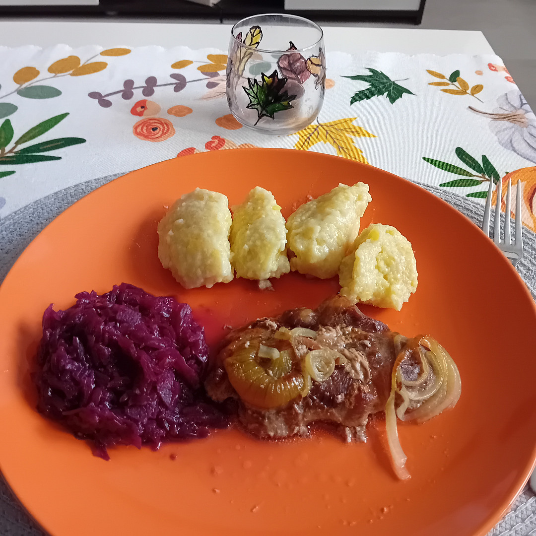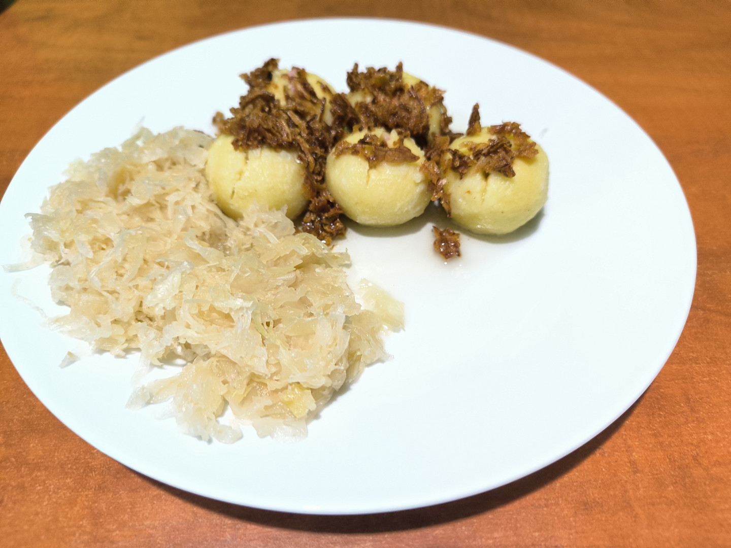 Na oběd přijde Ella, tak jsem sáhla do mrazáku a uvařila jsem plněné bramborové knedlíky s uzeným, cibulkou a syrovým zelím 😋