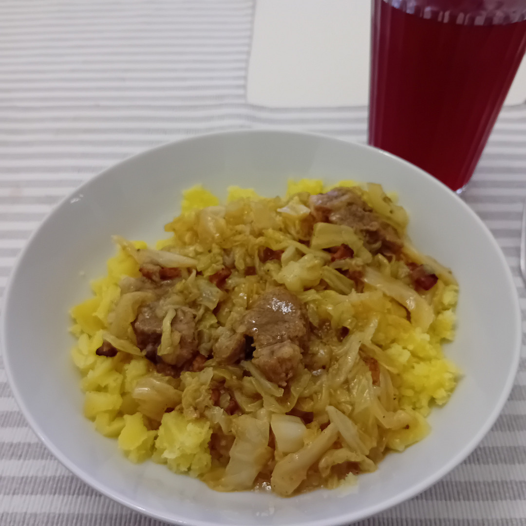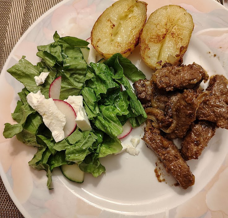 u nas polevka s cervene cocku, hovezi jatra na cibuli , opecene brambory a zeleny salat.