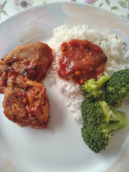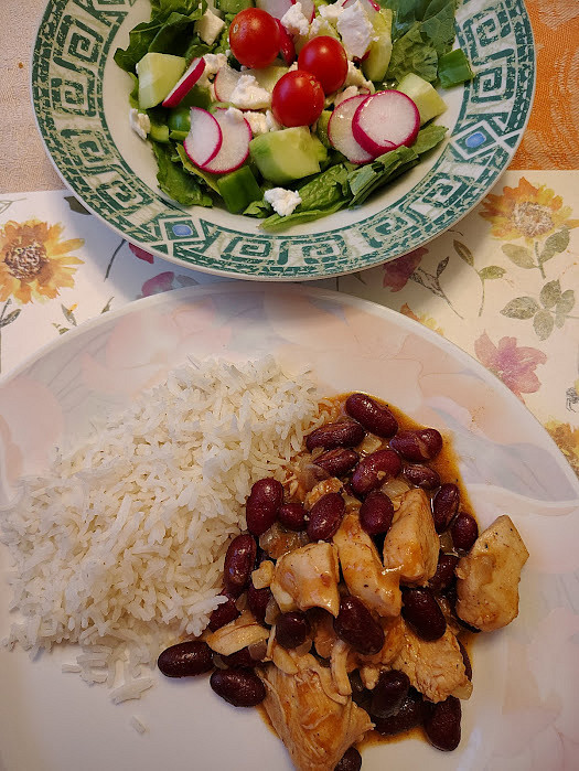 u nas dnes kureci prsicka s cervenymi fazolemi a znovu ryze, a zeleny salat.😊