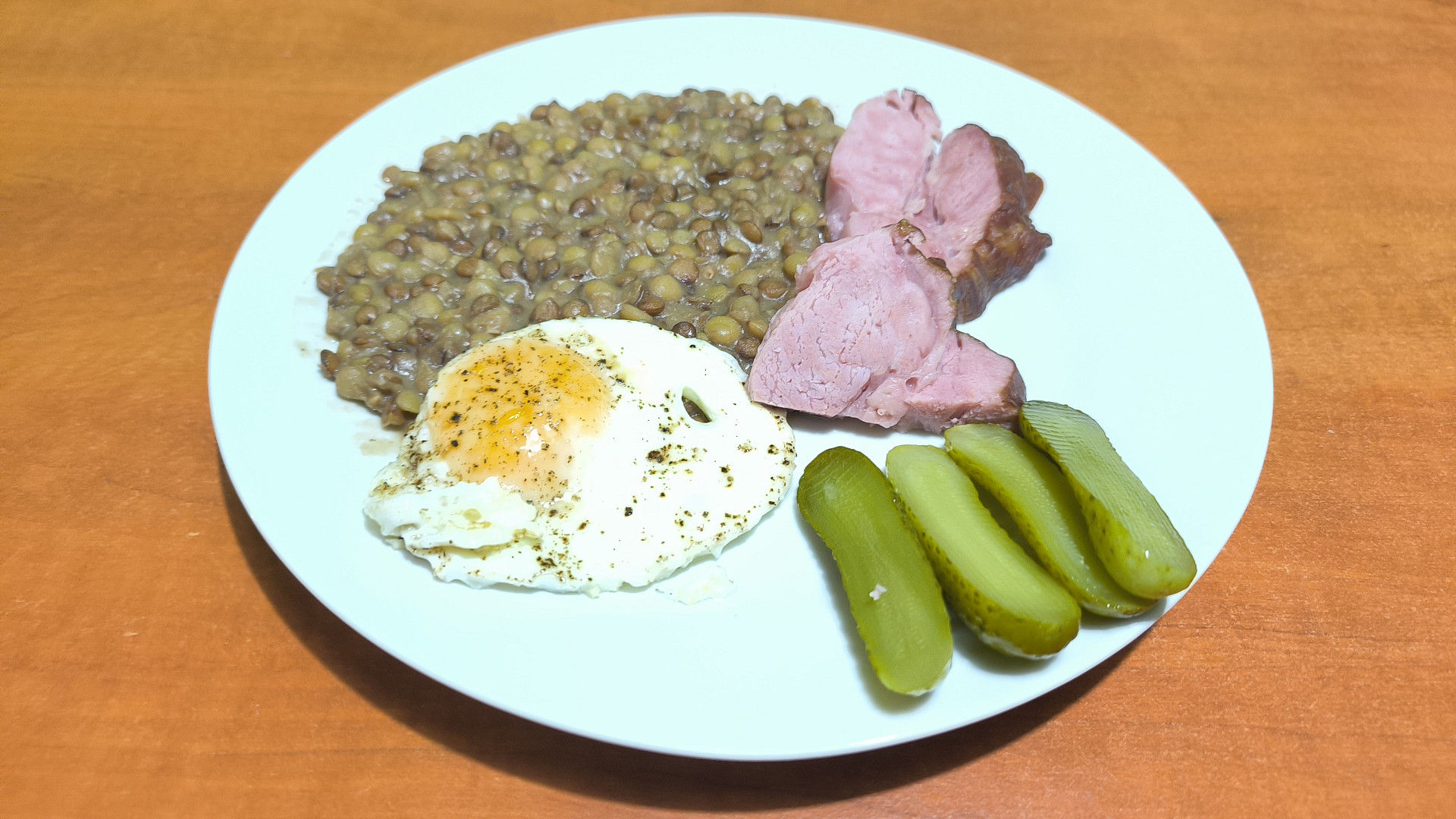 U nás dnes čočka na kyselo, uzená krkovička, volské oko a kyselá okurka.😋