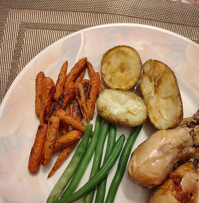 Vcera jsme meli kureci palicky s pecinymi brambory a s pecenou mrkvi a zelene fazolky.