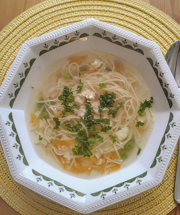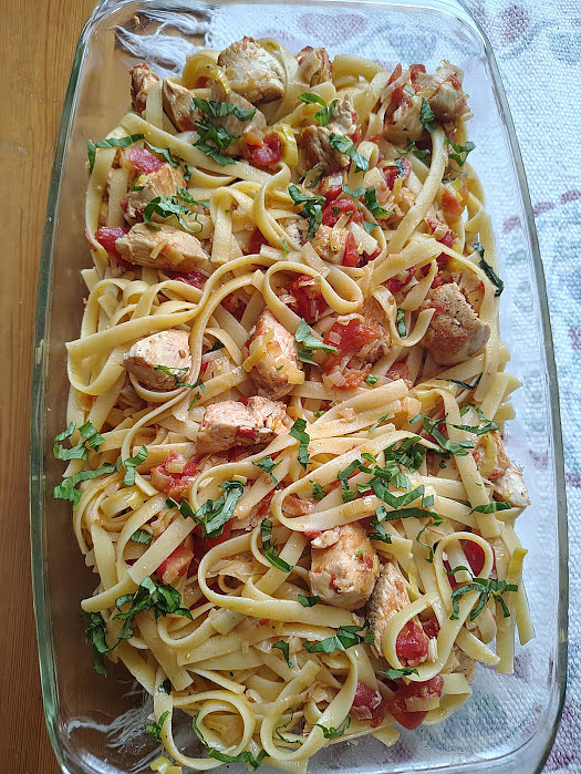 U nas dnes kureci polevka, fettuccine s kurecimi kousky,porkem, rajcaty ,bazalkou a parmesan syr. Ke kave jsem upekla jablkovou babovku podle Isindy. Trochu se me porusila pri vyklopeni, ale voni moc pekne.