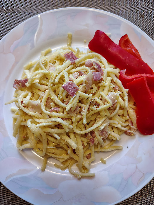 u nas polevka od vcera, Spaetzle se slaninou a vajickem, k tomu cervenou papriku. Udelala jsem spenatovo avocado smoothie.