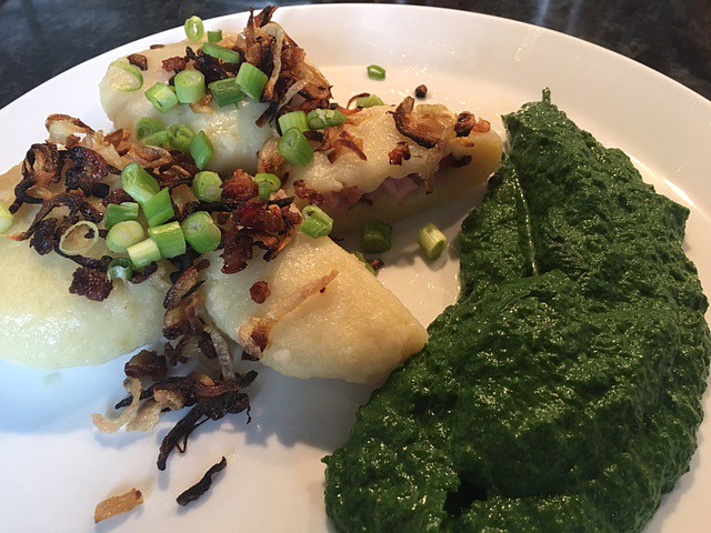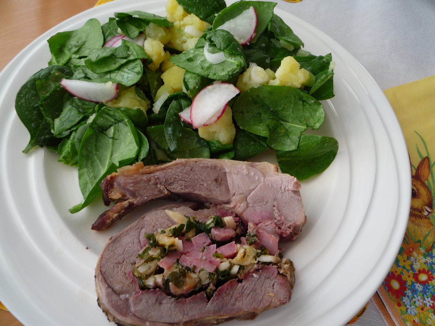 U nas se v poslednich dnech varil spenat s knedliky plnenymi uzenym, hlavicka, kruti na cervenem vine s bramboracky, sekana s uzenym, articokovym pyre a novymi brambory.
