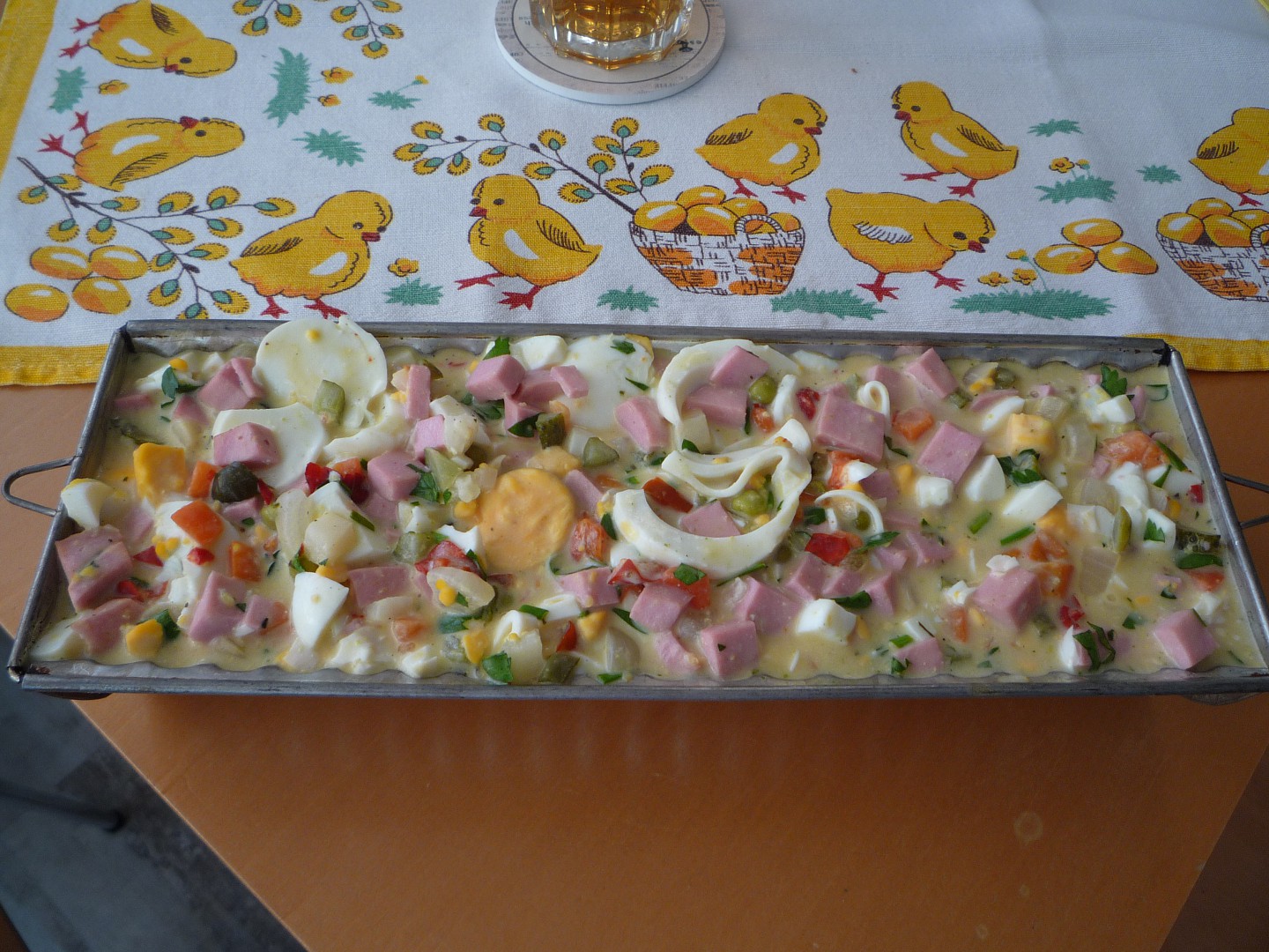 Dnes máme kuřecí plněný řízek, já nivou a přítel šunkou a sýrem, k tomu hranolky a zeleninka. Na zítra upeču mazance, pro ségru a rodiče, mamka nám na oplátku upeče beránka