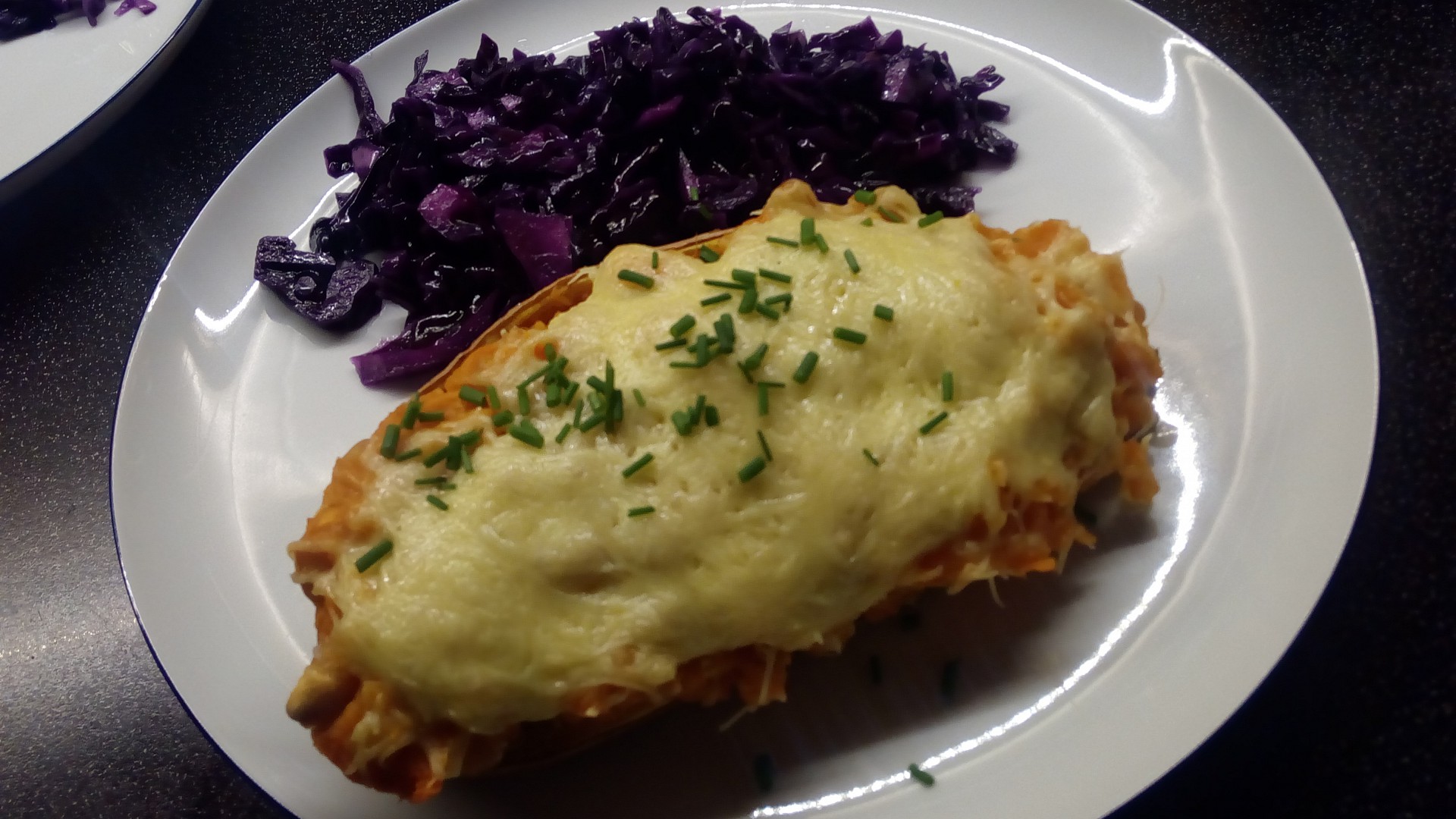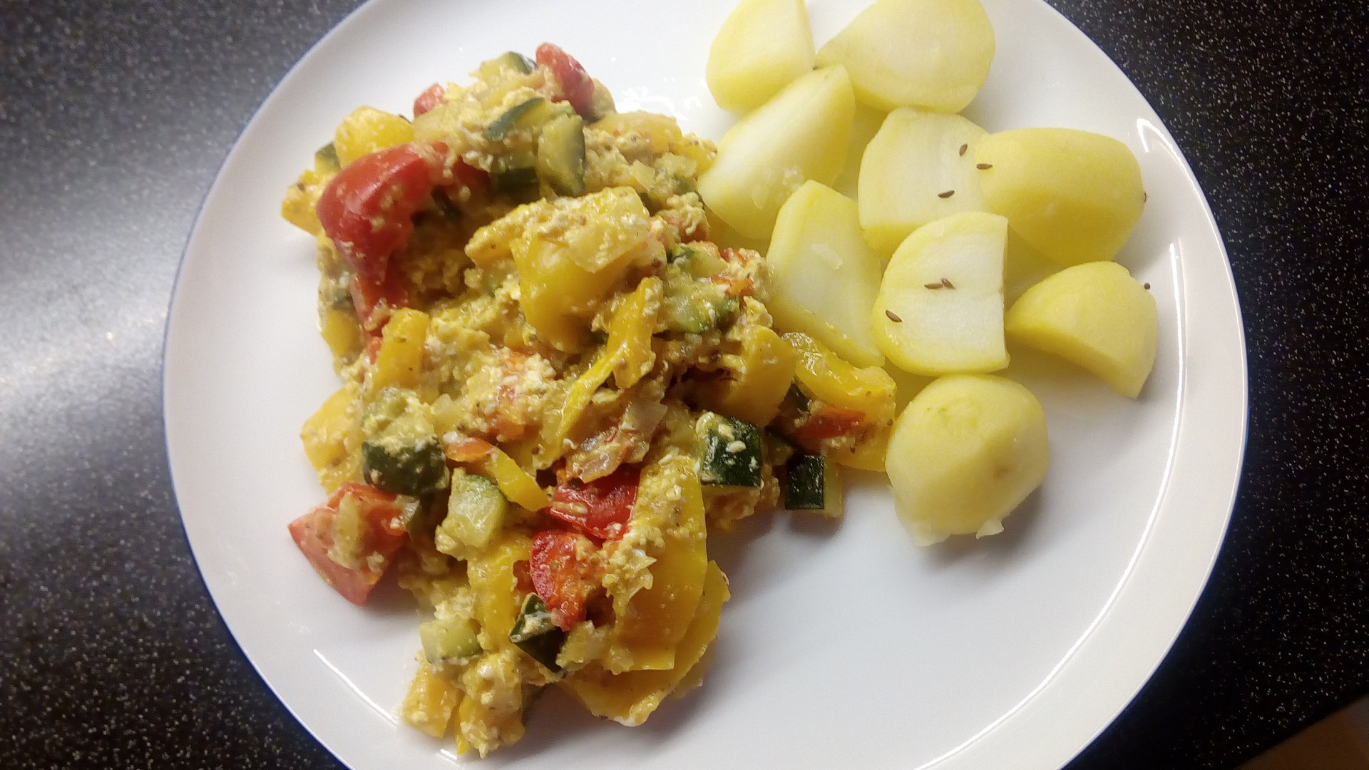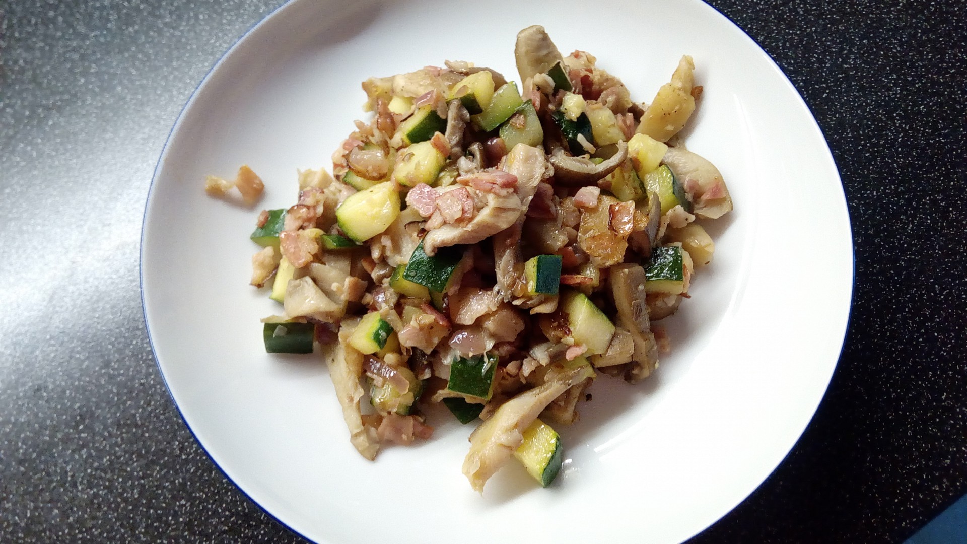 Krom toho budeme mít kuřecí prso na cuketě a opečený brambor, nic složitého ale moc nám to chutná :)
