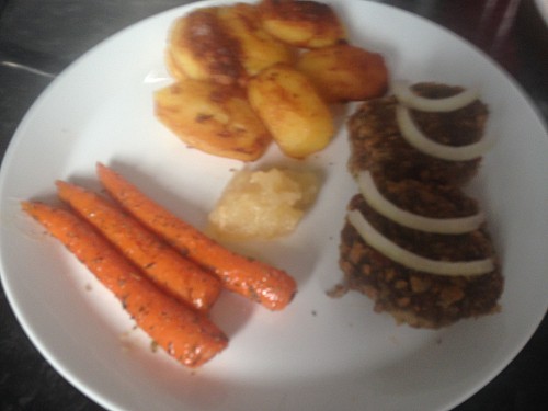 V sobotu jsme meli gulas na pive s knedlikem a v nedeli karbanatky s dusenou mrkvina masle na tymianu a opecenym bramborem, k tomu jablecne pyre.