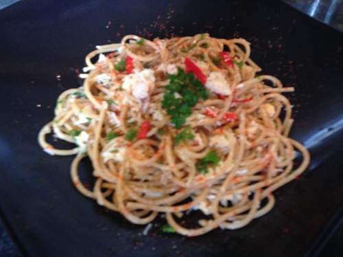 U nas byly v sobotu celozrnne spagety s cili, cesnekem, krabim masem a parmezanem.