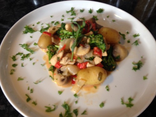 V nedeli kure se zeleninou, zampiony a bramburky "z jednoho hrnce" - na bilem vine, estragonu a smetane.