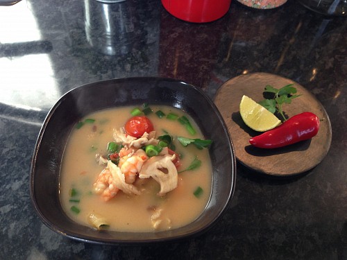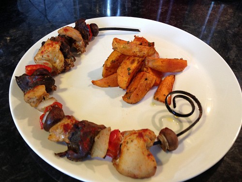 U nas se varilo jen v nedeli - thajska polevka s krevetama a raznici v troube (kureci plus jatra) se sladkym bramborem.