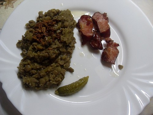 Dnes byla čočka a kousek uzeného,Aby se nás drželi peníze