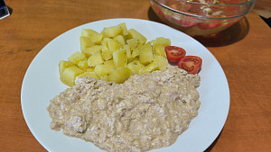 u nas jeste bramborova polevka a veprove platky na mini rajcatek a k tomu upecene sladke brambory a zelene fazolky.😊