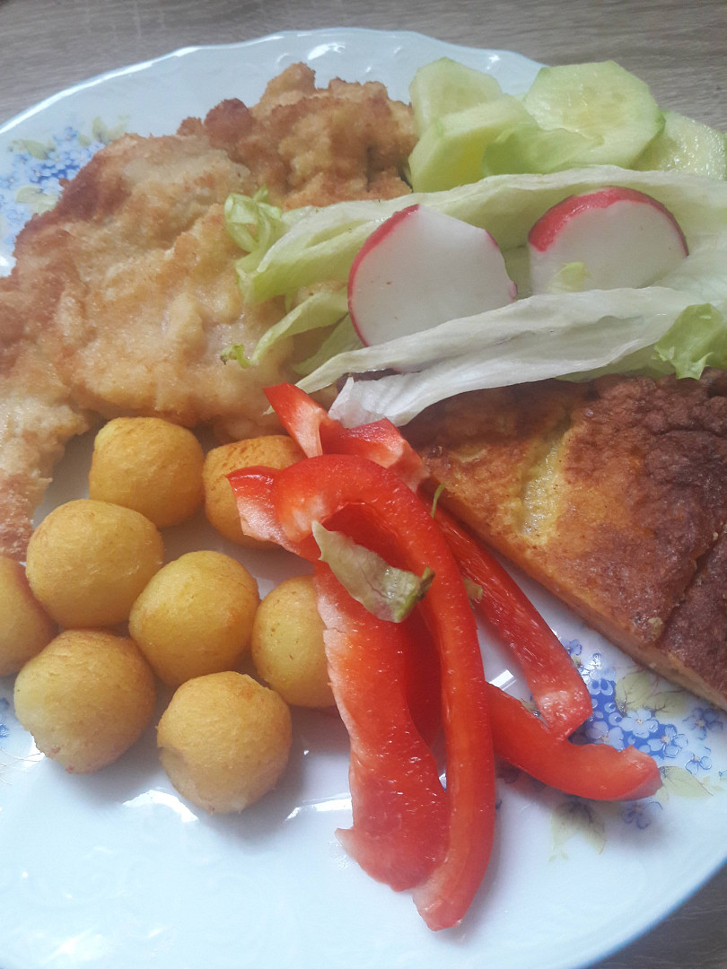 U nás dnes k obědu sumeček, vařený brambor s máslem a Holandskou omáčkou 😋. Jo a okurkový salát.😀