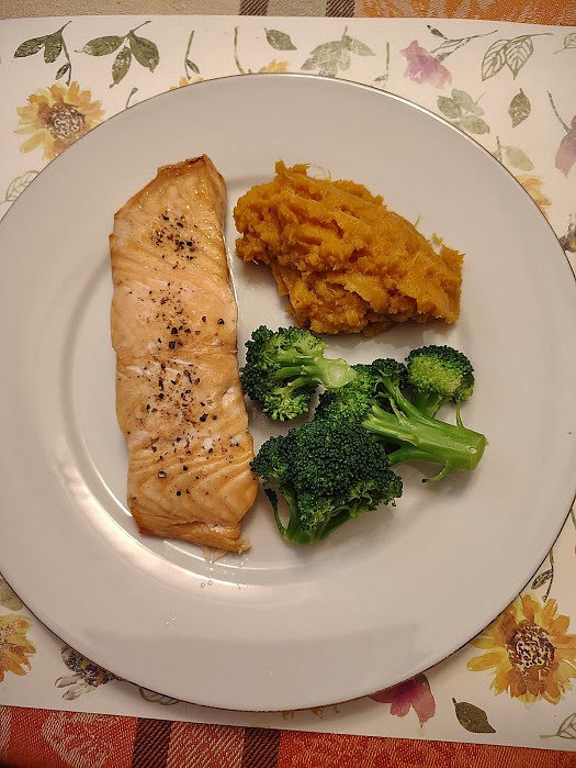 u nas dnes zbytek kvetakove polevky, losos, sladke brambory a broccoli na pare.
